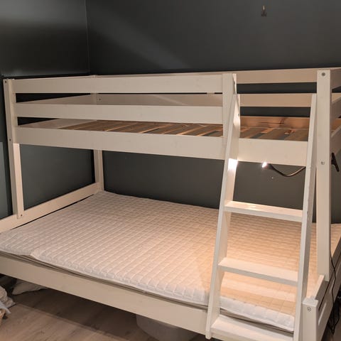 Säng där nedre liggplats är 120 cm och övre är 90 cm, extra tjocka madrasser, sparsamt använd.
