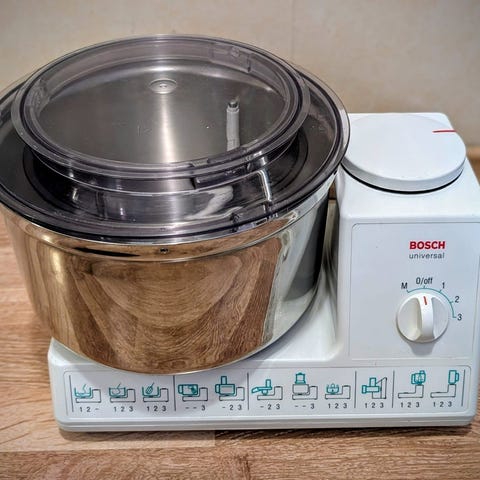 OBH Nordica köksmaskin med rostfri bunke, visp, kakdegsblandare och degkrok. Har en lagad spricka i locket till bunken men är inget som påverkat funktionen alls. Klarar av degar på 5dl degvätska men med mer vätska tycker jag den går sämre.