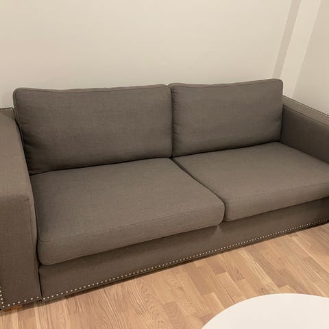 Säljer en använd grå 3-sitssoffa. Den är stadig och i ganska bra skick (se bilder). Det går att plocka bort tyget från sittdynorna för tvätt mm.