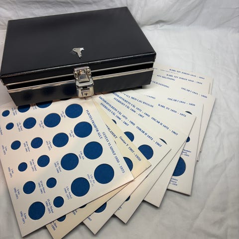 Europas Guldarv myntsamlarbox med 12 fack, tillverkad i trä och klädd med blå sammet inuti. Lådan är avsedd för förvaring och visning av mynt och har en vikt på cirka 1,2 kg.