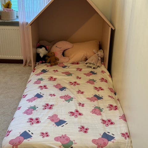 Har stått i ett barnrum i ca 1 år men aldrig använts. Den har en ram som liknar ett hus och är anpassad för barn.
