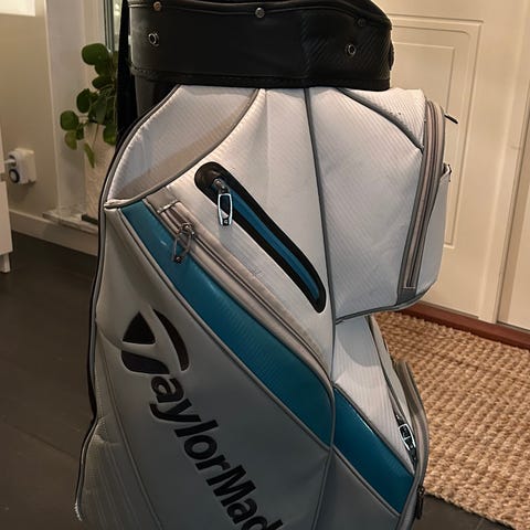 TaylorMade golfbag med ståstativ och flera fack för förvaring. Färgerna är grå och lila. Snygg, lätt och behaglig att bära.