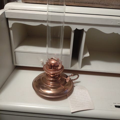 Grön hängande oljelampa med skärm i glas och detaljer i metall. Lampan är avsedd att hängas i taket med hjälp av kedjor och har en klassisk design.