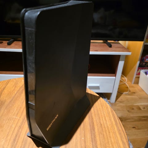 Netgear Nighthawk M1 mobilt WiFi-hotspot med svart färg. Enheten har en display för statusinformation och portar för USB och Ethernet-anslutning. Levereras med ett skyddande fodral. Går att spela konsol mobilt på M1. Stabil även vid rörelse