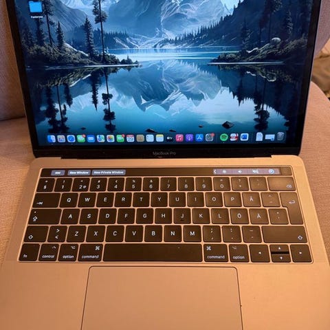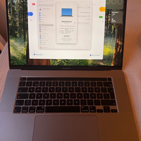 Apple MacBook Pro Laptop med skärm i färg och bakgrundsbelyst tangentbord. Enheten är ansluten till ström och visar systeminställningar för säkerhet och integritet samt översikt över datorns specifikationer.