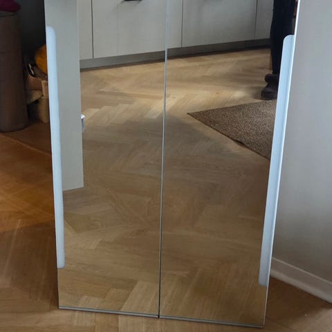 Tvättställ med dubbla blandare och underliggande förvaringsskåp i trä med lådor. Spegelskåp med 4 dörrar och inbyggd belysning.
