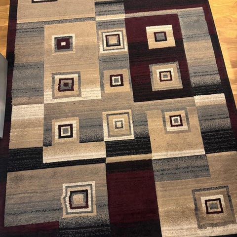 Säljer en stilren och modern matta i ett exklusivt mönster i svart, vitt och guldiga toner. Mattan ger ett lyxigt intryck och passar perfekt i vardagsrum, matsal eller större sovrum.
