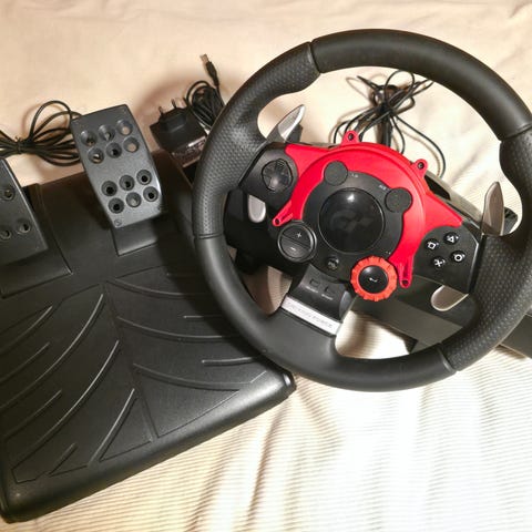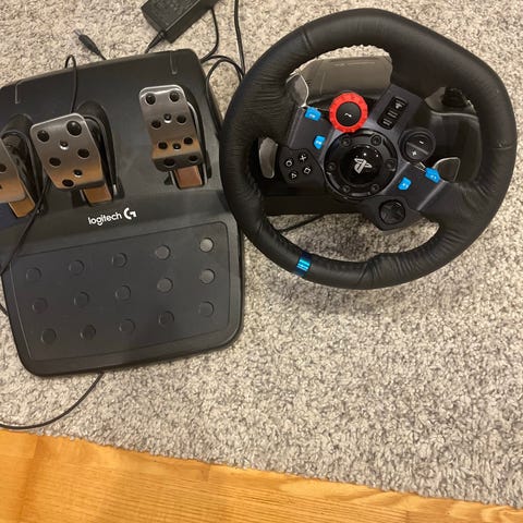 Logitech G920 Racing Wheel med pedaler och anslutningskablar. Utrustad med ratt och tre pedaler för spelkontroll.