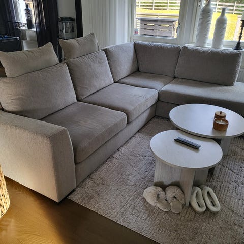 U-formad hörnsoffa med divan och schäslong i beige sammet, stor och rymlig, bekväm för vardagsrummet. matchande soffbord, använd i 7 månader, säljes p.g.a. flytt till mindre lägenhet.
