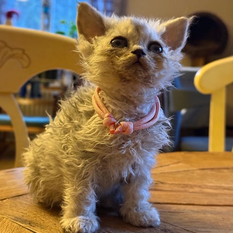 Selkirk Rex har en lockig päls som ras. Kattungen har heterozygot vilket betyder att hon har en uppsättning rak päls och en uppsättning lockig päls. Du kan läsa mer på Rexringen.se
