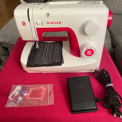 Singer Talent symaskin i vit färg. Maskinen är utformad för att användas med olika typer av tyg och har grundläggande funktioner för sömnad.