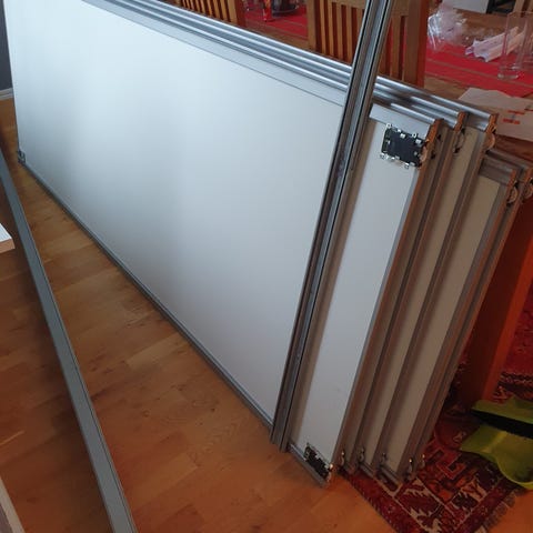 Skänker en garderob 2×100 cm med skjutdörrar. Den har 8 hyllor och 2 klädstänger. Den har spår av användning. Skänks utan utdragbara korgar.