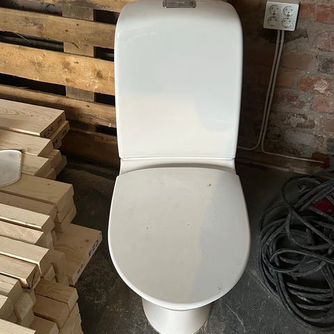Vit toalettstol i porslin med sits och spolkåpa. Standardmodell för badrum.