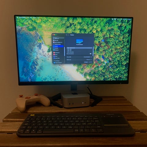 Apple Mac mini stationär dator med M4 pro-chip, 12-kärnig processor och 16-kärnig grafik. Utrustad med 24 GB enhetligt minne och 512 GB SSD-lagring. Har två USB-C-portar på framsidan, hörlursuttag, tre Thunderbolt 5-portar, HDMI-port och Gigabit Ethernet.