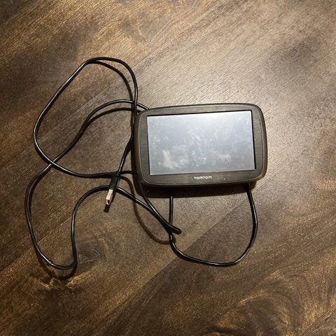 TomTom Go 500 GPS enhet inklusive en hållare för fordon och en förvaringsväska. Enheten har 5 tums touch-skärm