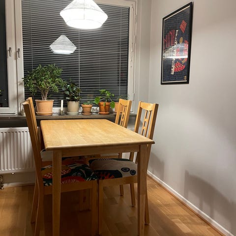 Bord från IKEA: 140×84 cm med två extra skivor à 40×84 cm (total längd 220×84 cm).