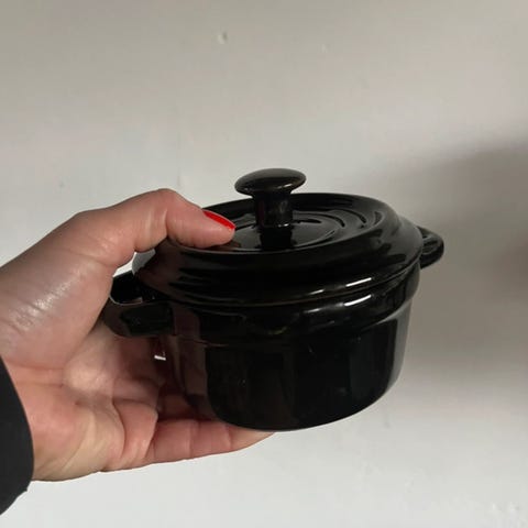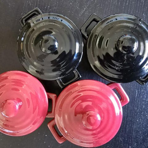 Grytorna klarar tack vare sitt dubbla emaljlager höga temperaturer och fungerar på alla sorters spisar, från vedeldad till induktionshäll. Diametern är 10cm och höjden är 5 cm, Priset är för 4st