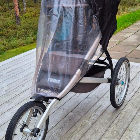 Thule barnvagn med tre hjul och ram i metall. Designad för att underlätta transport av barn vid promenader och löpning.