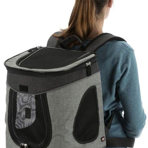 Ryggsäck för husdjur i grå polyester. Utrustad med vadderade och ergonomiskt formade bärremmar samt midjebälte med klickstängning för bekväm bärning. Stabil polypropylen-bottenplatta med mjuk vaddering och konstpäls (sherpa). Nättak som kan stängas och fällas upp. Sidofickor för förvaring. Ingång på framsidan och extra remmar.
