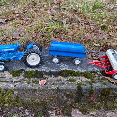 Leksaksset med bondgårdstema. Inkluderar traktor, skördetröska, vagnar, djur och tillbehör.
