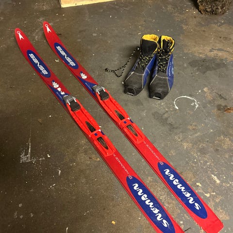 Längdskidor vallningsfria 147 cm och pjäxor Salomon storlek 39