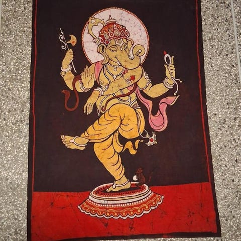 Handmålat motiv på batiktyg.