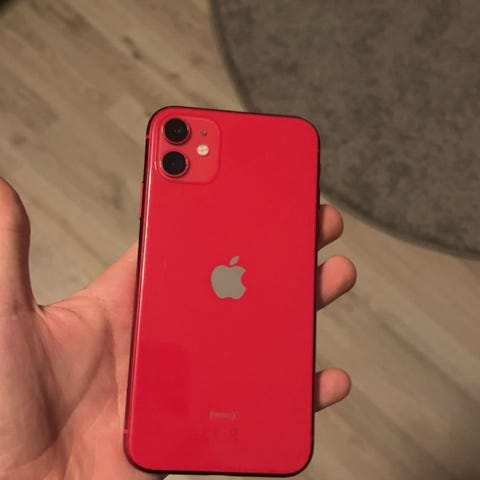 Apple iPhone 11 mobiltelefon med 64 GB lagringsutrymme i färgen röd. Skärmen bak har små sprickor och fram inga sprickor.
