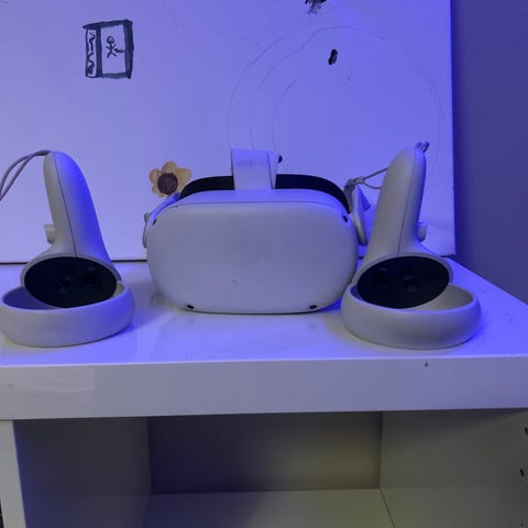 Knappt använd Oculus Quest VR-headset i kartong, inklusive laddkabel och handkontroller. Används för virtuell verklighet och spelupplevelser.