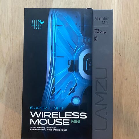 LAMZU trådlös mus i vitt och blått. Musen levereras med en USB-mottagare (dongle) laddningskabel och förvaringspåse. Det är en jätte bra mus den är lätt med vikten 57g, max dpi är 26000 och 4khz polling rate