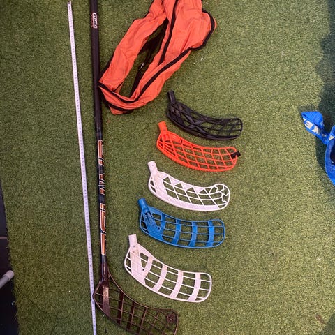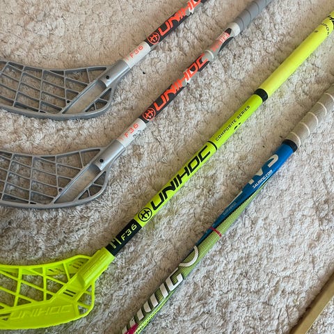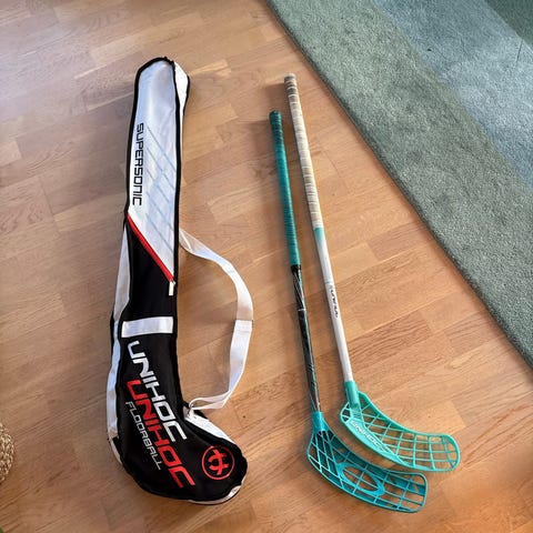Set med innebandyklubbor från märkena Unihoc och Salming. En Unihoc för tricks, 75 cm skaft, använd två gånger. En till Unihoc 75 cm. En Salming skaftlängd 96 cm använd en gång. Skyddsglasögon Salming Junior 125 mm. Förvaringssäck och bollar. Material varierar.