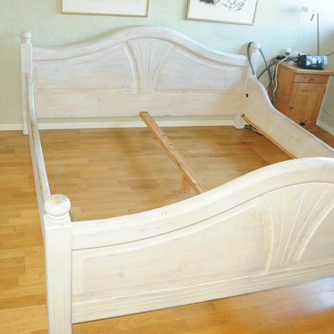 Sängstomme och nattduksbord i lantlig stil i samma serie. Äldre möbel i gediget vitlaserat trä, där sängen går att dela i fyra delar (enkel och stabil ihopsättning med hakar).