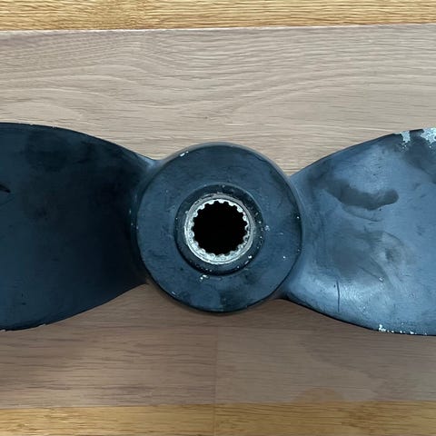 Okänd modell med axel o propeller med tre blad i mässing. Propellern har en axel och fäste med fyra monteringshål. Produkten är avsedd för användning på båt och är tillverkad av mässing.