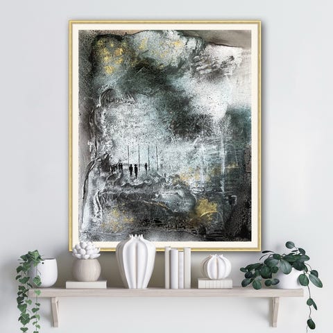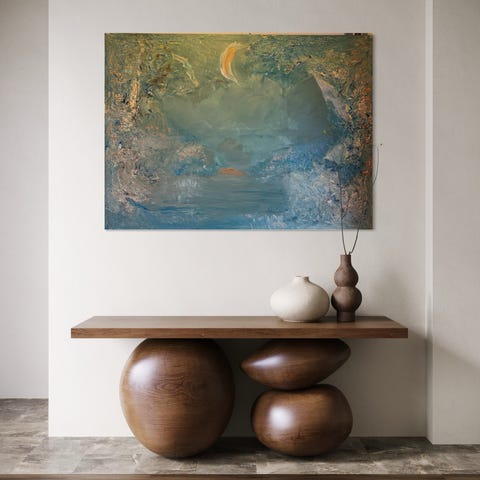 Egenskapad abstrakt konstverk i akryl med färgtoner i blått och grönt med guldinslag.