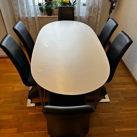 Santino Matgrupp bord i vit laminat. Stort bord L 180-280 cm, förlängningsbart med två extra skivor a 50 cm styck. Spännben och underreve i kromat metall. Reptålig & lättskött yta i laminat. Snyggt, trendig och cool. Passar för matsal eller kök. Aktuellt ordinarie pris 12 995 Kr