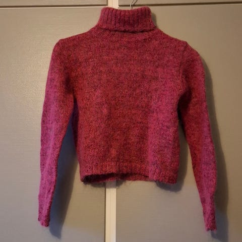 Röd stickad tröja med missonimönster.