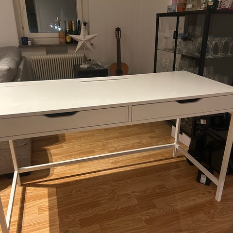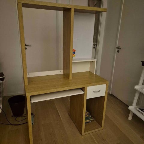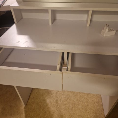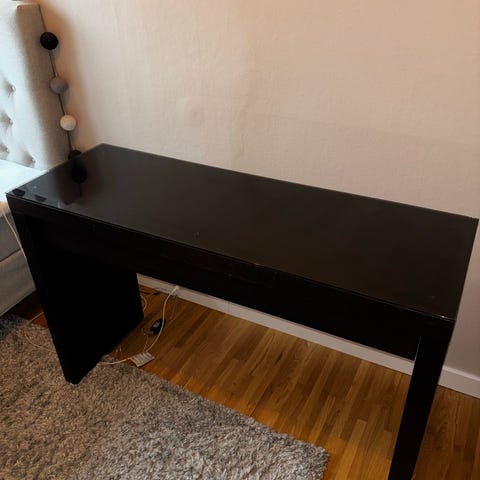 Säljer ett stilrent och praktiskt sminkbord i mörk träfinish. Bordet har en stor spegel, två rymliga lådor samt hyllor på sidorna för smink, hudvård och tillbehör. Stabil konstruktion och gott om förvaringsutrymme – perfekt för smink, hårstyling eller som mindre skrivbord.