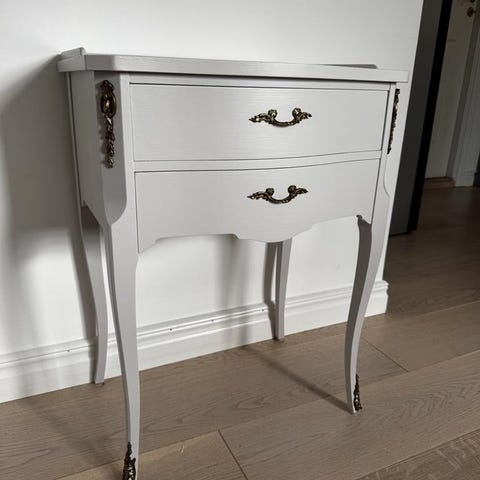 BYRÅ, SÄNGBORD, intarsia, tre lådor, 1900-talets andra hälft. Byrå/ nattduksbord med tre lådor och marmorskiva. B. 32,5cm , D. 31,5cm , H. 71cm. Skick som på bilderna. Handtaget i sista lådan är saknade tyvärr.