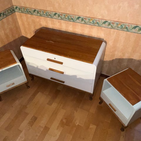 BYRÅ, SÄNGBORD, intarsia, tre lådor, 1900-talets andra hälft.