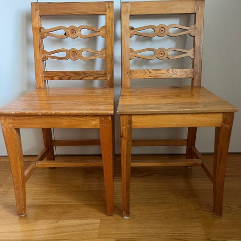 Handgjorda stolar med dynor 2 st. Massivt trä.