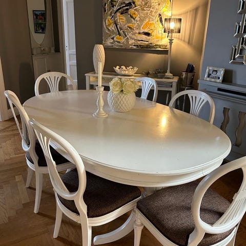 Set bestående av ett träbord och fyra trästolar. Stolarna har gråa sittdynor med knappar. Bordet och stolarna är i naturligt träutförande. Passar för matplats eller kök.