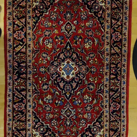 En fin äldre orientmatta med dåliga fransar men i övrigt fin så väl värd lite omsorg med att langettera den.