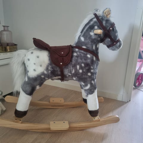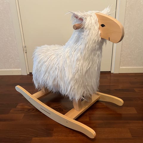 Säljer en gunghäst som ser ut som ett får istället för en häst. Precis som en traditionell gunghäst erbjuder lammet trygg och rolig lek. Dess mjuka päls är avtagbar och kan tvättas i maskin, vilket gör den enkel att hålla ren.
