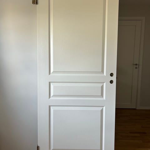 Innerdörr i vitt med dekorativa paneler. Dörren har ett klassiskt handtag och lås med nyckelhål. Passar för användning inomhus i hem eller kontor. Just mu finns bara en nyckel till alla dörrar
