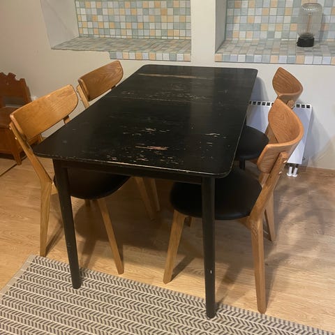 Väldigt bra skick, finns endast två minimala märken på bordsskivan. Nypris 12.995 kr, passa på att fynda ett fint och stabilt bord.