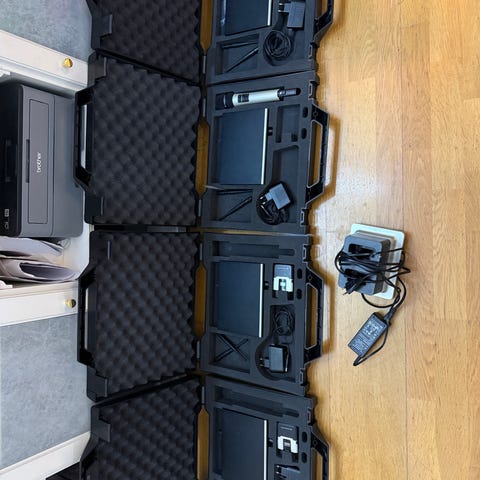 2st Sennheiser EM 100 True Diversity Receiver med frekvensområde 566-608 MHz. Enheten är designad och tillverkad i Tyskland och drivs med 12V/300mA DC-strömförsörjning.