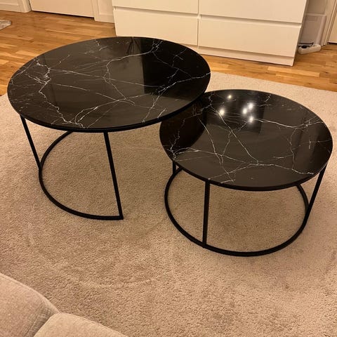 Soffbord i 50-tals design. Slipades för ca 20 år sedan. Den har några fläckar som sannolikt kan skrubbas eller kanske slipas bort - framför allt en ring från ett metallföremål som stått på bordet.