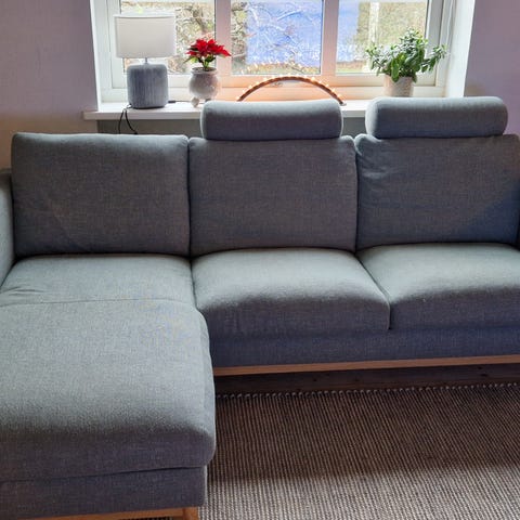 Mio sits soffa i bra skick med IKEA glasbord .