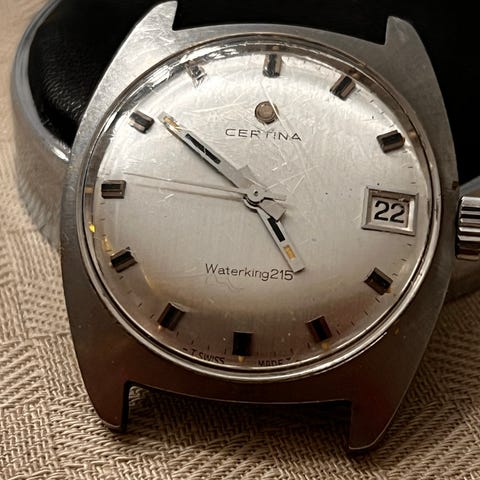 Certina herrklocka med fyrkantigt metallhölje, silverfärgad urtavla och svart läderarmband. Klockan har analoga visare och tydliga timmarkeringar. Klockar tickar fint och håller tid som den ska, testad under 24 timmar. Mekaniskt urverk.