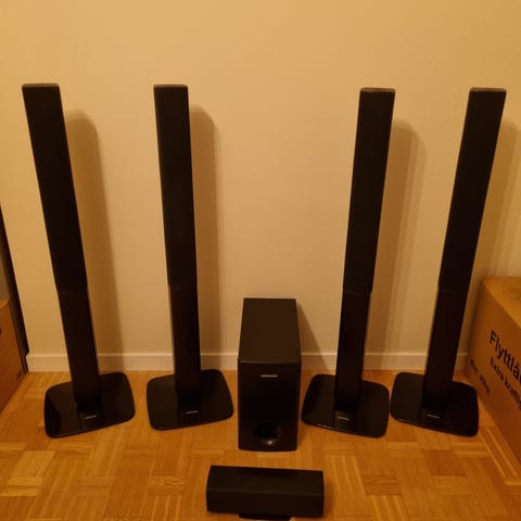Samsung ljudsystem med högtalare och subwoofer. Systemet är avsett för ljudförbättring och kan användas med olika enheter för att förbättra ljudkvaliteten i hemmiljö.