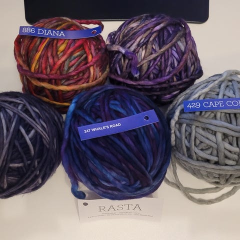Hobbii Frutta garn tillverkat av 100% pima bomull. Garnet är flerfärgat, lila och orange och medium tjocklek, lämpligt för olika handarbetsprojekt som stickning och virkning.